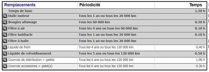 Exemple de plan d’entretien pour un Dacia Duster I 1.6 16V 105 ch, avec un changement de bougie préconisé à 60.000 km et le temps de main d’œuvre correspondant.
