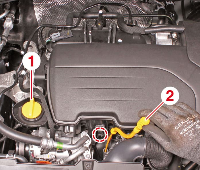 - Identifiez le bouchon de remplissage (1) et la jauge à huile (2) (Fig.1).