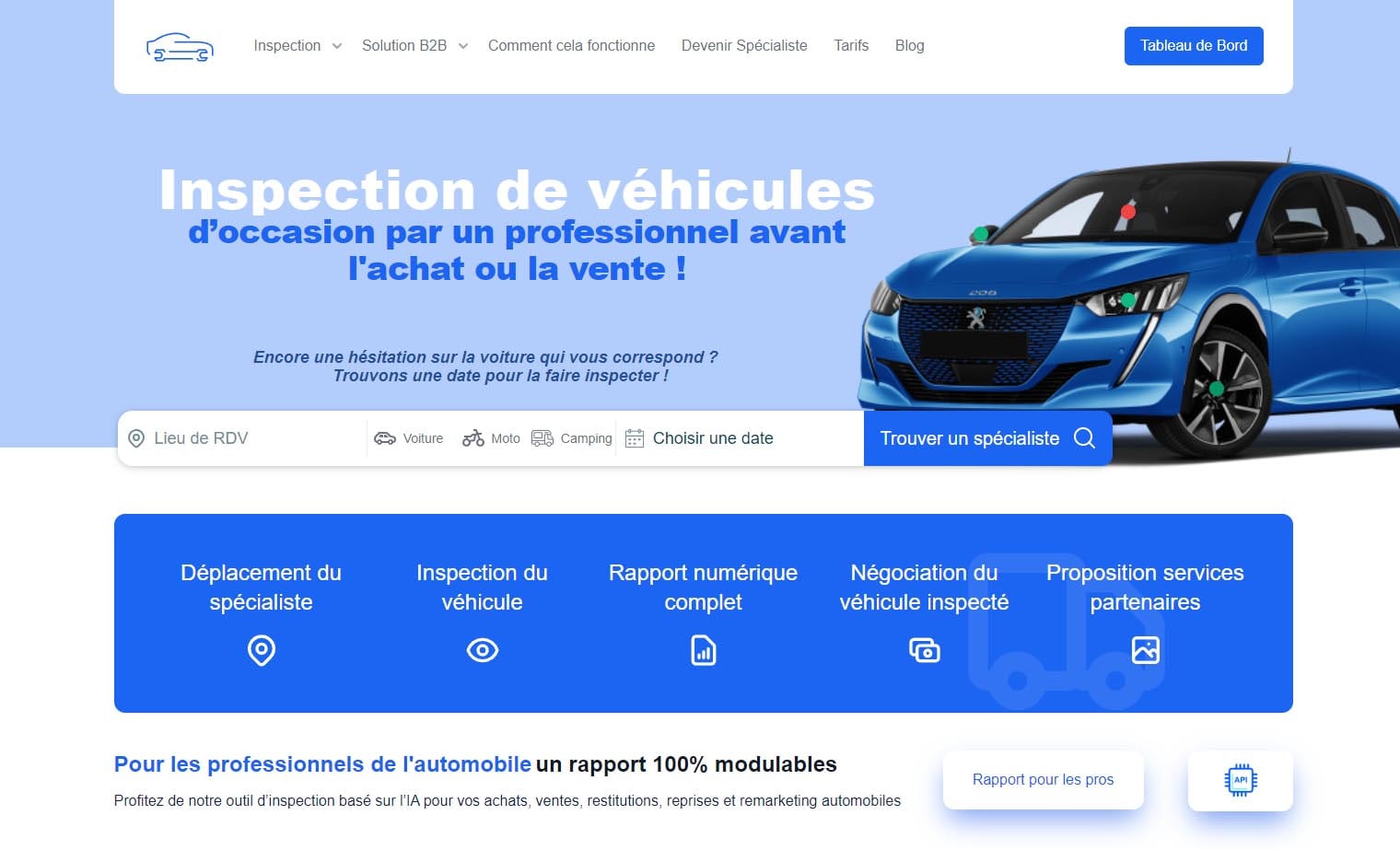 L’inspection se fait sur plus de 200 points de contrôle, et s’appuie sur des centaines de photos, intérieur et extérieur, optiques et pneus, afin de repérer les éventuels vices cachés. Comprend également le moteur et les options du véhicule d’occasion. L’expert rend ensuite son rapport numérique complet qui comporte un système d’étoiles (de 1 à 5, comme les hôtels) et de de notes couplées au prix du véhicule. Alloccasions propose également son aide au client dans la négociation lors de l’achat en se basant sur une estimation du prix fournie par l’intelligence artificielle.