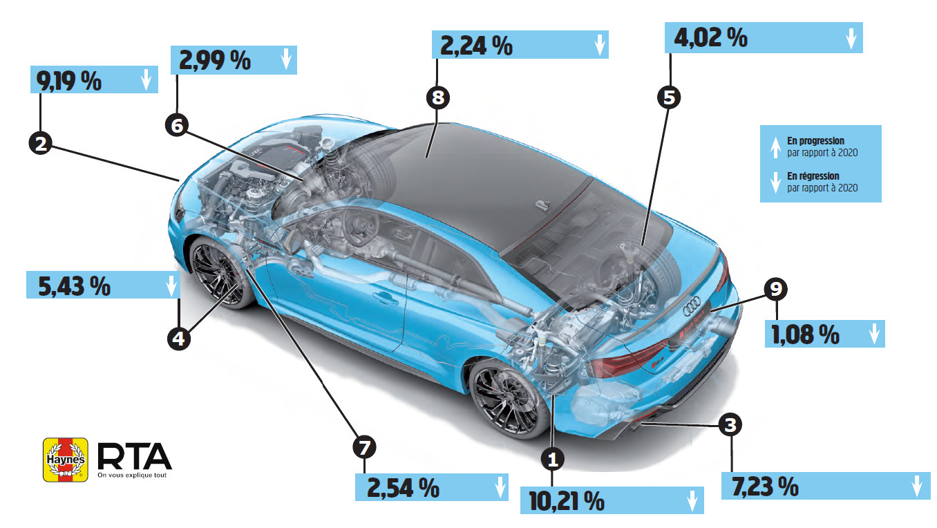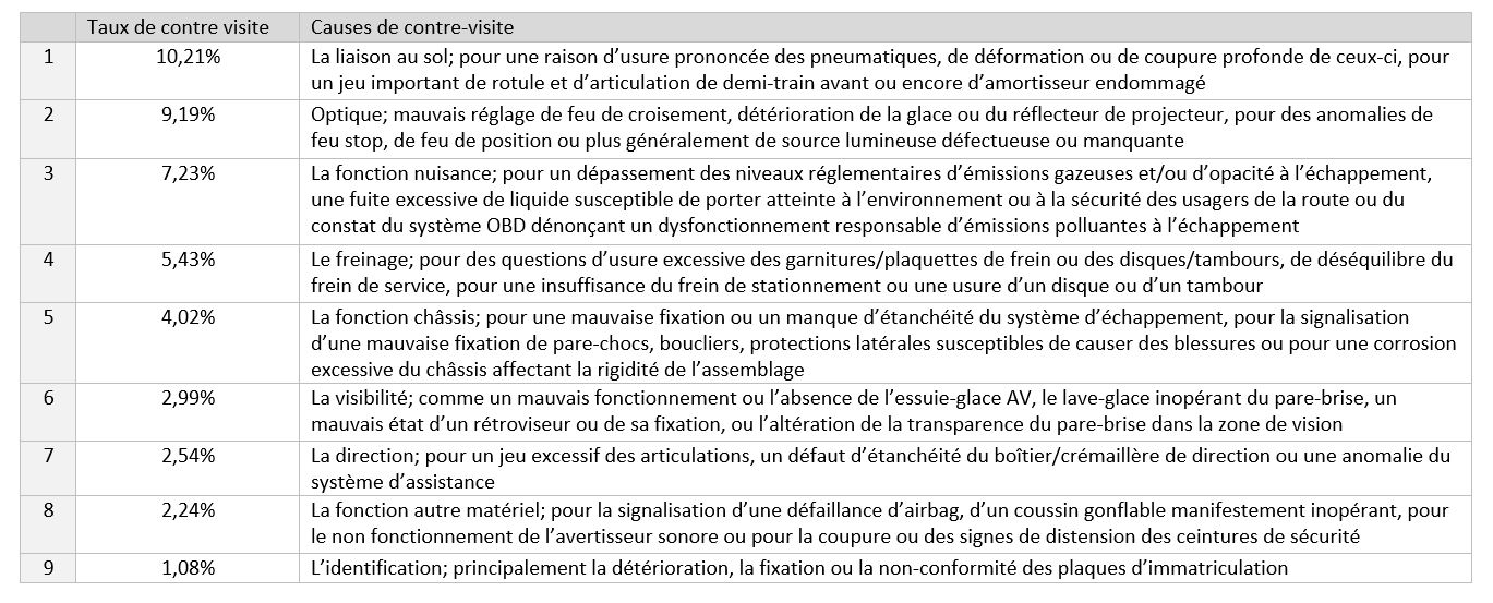 Parallèlement à cela, le taux de prescriptions de contre-visite a légèrement diminué. Il s’est établi en 2021 à 19,47 %, contre 20,78 en 2020. À noter que 18,77 % de ces contrôles techniques périodiques ont fait l’objet d’une prescription de contre-visite pour défaillance majeure et 0,70 % pour défaillance critique. Le détail de ce rapport indique que, pour 10,21% des véhicules contrôlés, c’est une usure ou une différence d’usure de pneumatiques, mais également un jeu important ou anormal des articulations du train avant et un défaut d’étanchéité des amortisseurs qui ont été dénoncés. Il mentionne également que, pour 9,19 % du parc contrôlé, un défaut d’éclairage et de signalisation reste d’actualité. Enfin, les défauts liés aux nuisances prenant en compte le contrôle de la pollution sont en cause pour 7,23 % des autos contrôlées.