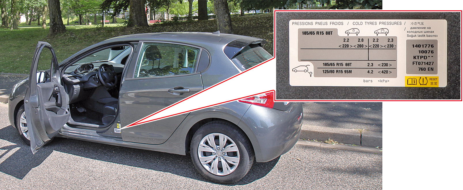 Localisation de l’étiquette de pression des pneus (Peugeot 208)
