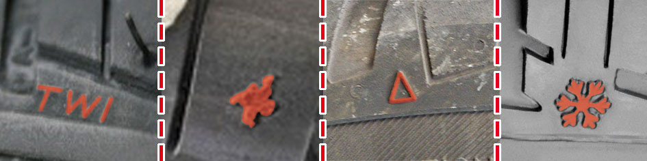 Pour faciliter la recherche des témoins sur la bande de roulement, les manufacturiers apposent des marques sur l’épaule du pneu au niveau de l’alignement des témoins d’usure ; comme par exemple l’abréviation TWI (Tread Wear Indicator) ou bien le personnage Michelin : le Bibendum.