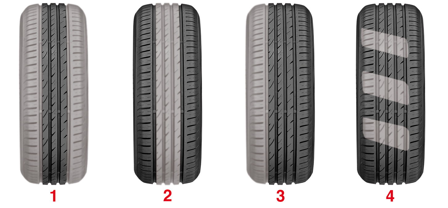 Une usure d’un seul côté de la bande de roulement (3) indique un mauvais réglage de la géométrie des trains roulants ou une pièce du train déformée.