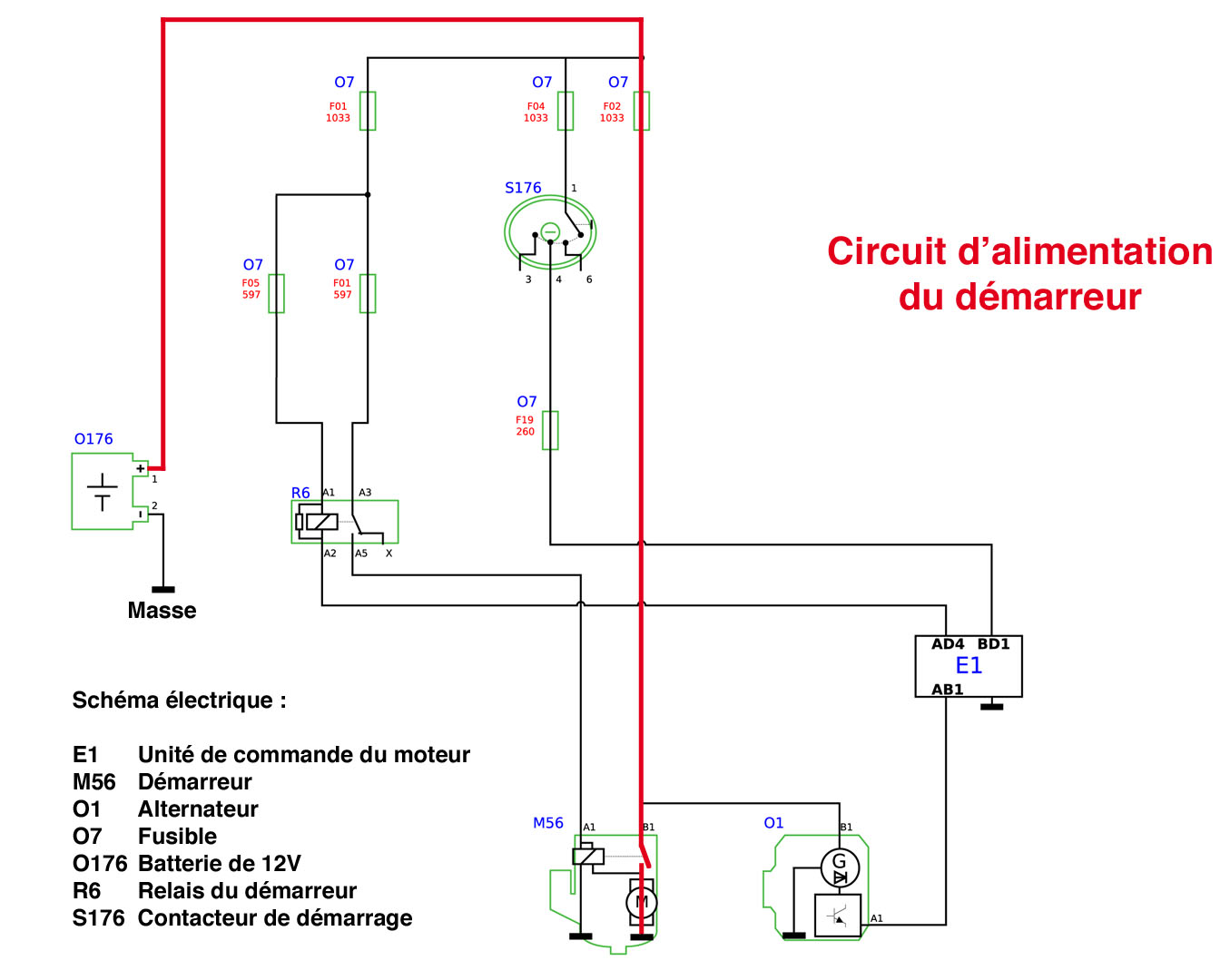 - En actionnant le démarreur, faites une mesure de tension entre la borne négative de la batterie et un point de masse sur le démarreur : la tension relevée doit être la plus faible possible (limitée à quelques dixièmes de volt). Une tension élevée indique un mauvais contact empêchant une bonne circulation du courant électrique. Faites de même entre la borne positive de la batterie et le raccord amont d'alimentation du démarreur. Vérifiez le fusible d'alimentation du démarreur. Vérifiez/nettoyez/resserrez les raccords de la batterie ainsi que ceux de la tresse de masse entre le moteur et le châssis. Faites de même pour le raccord d'alimentation du démarreur.