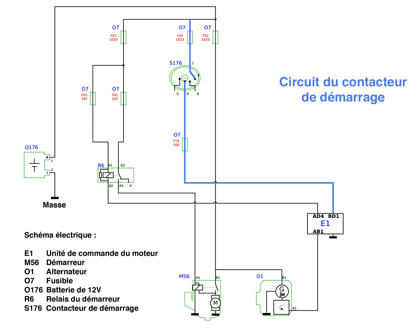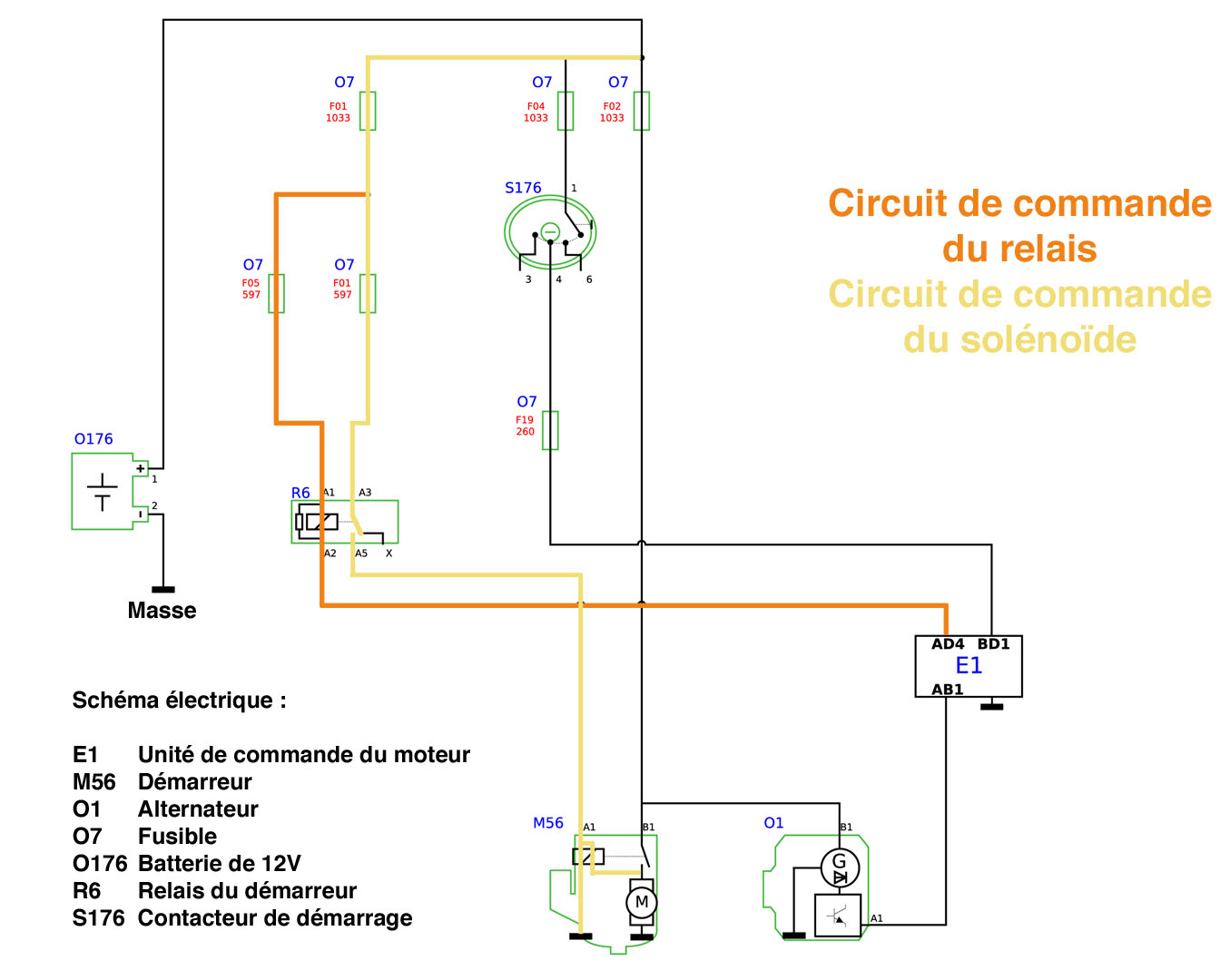 Si le signal de commande du relais est absent, vérifiez le circuit du contacteur de démarrage (le fusible F19 doit être alimenté lorsque la clé est en position "Démarrage") ainsi que les capteurs utilisés par l'unité de commande du moteur pour autoriser le démarrage (contacteur de pédale de frein ; capteur de position de pédale d'embrayage ; contacteur de point mort ; …).