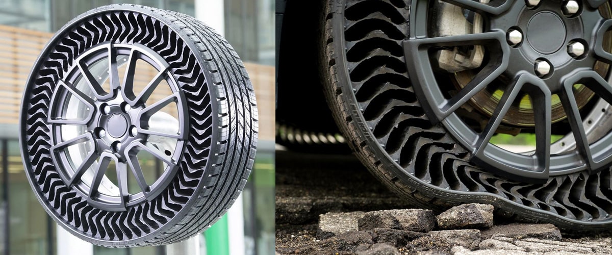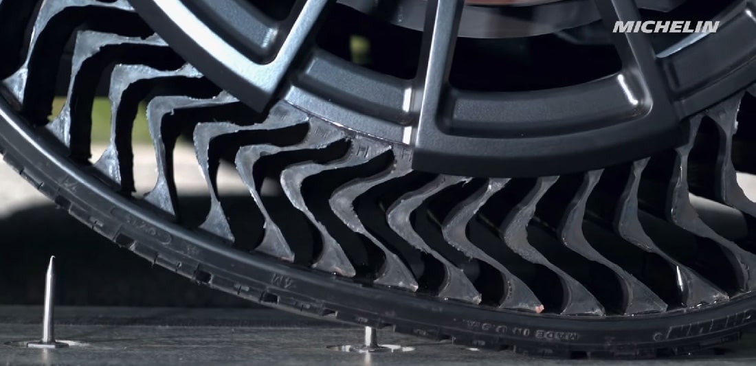 Cela fait plusieurs années que Michelin travaille sur ce sujet et d’autres marques comme Goodyear sont également dans la course du développement du pneu du futur increvable. Le fabricant Michelin nous avait présenté au salon de l’automobile en 2004 ses prototypes Tweel et Airless puis a déjà innové avec son premier pneu sans air increvable X Tweel qui a commencé à équiper les engins de chantier roulant à basse vitesse. La technologie arrive maintenant pour le grand public ! Michelin nous avait dévoilé son projet baptisé Uptis (Unique Puncture-proof Tire System) en 2019 : ce n’était qu’un prototype mais sa commercialisation pour nos voitures et utilitaires légers pourrait se faire bien plus tôt que prévu. En effet, dans une récente interview, le PDG de Michelin USA a confirmé que le lancement des pneus Uptis pourrait avoir lieu “dans les trois à cinq années” soit peut-être en 2025 sur les routes françaises.