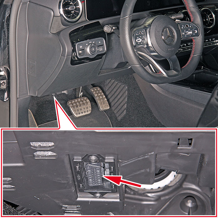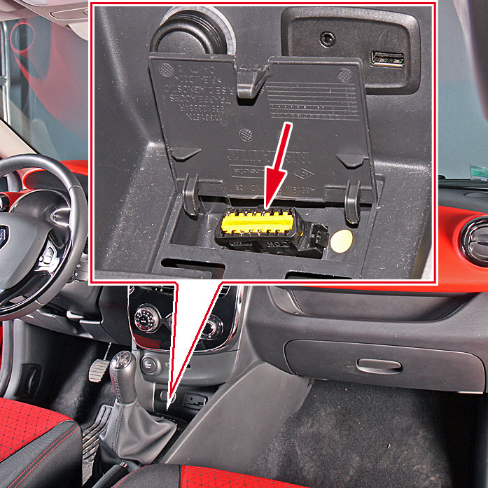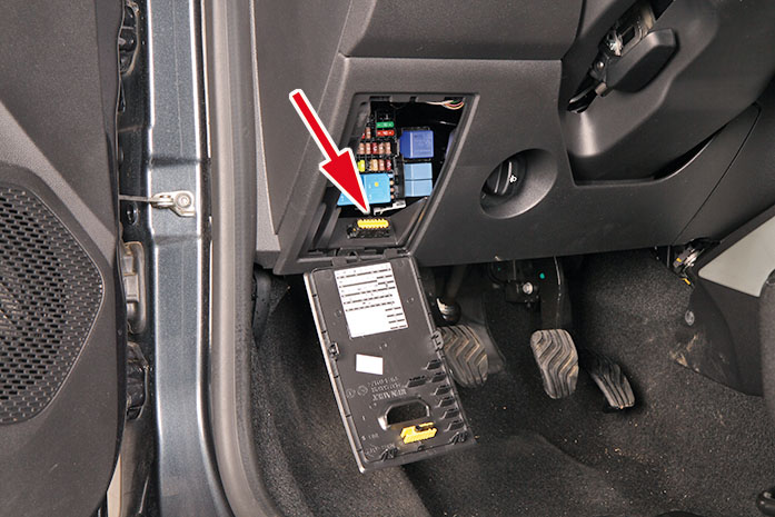 - à côté de la platine à fusibles habitacle (derrière une garniture ou une trappe).