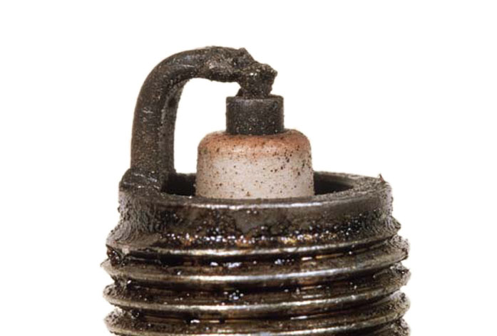Bougie d’allumage recouverte de suie grasse d’huile ou de calamine (entrée d'huile dans la chambre de combustion)