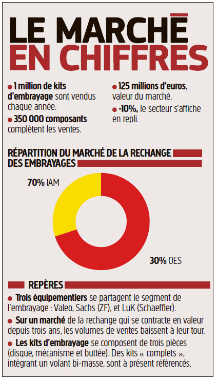 Heureusement pour les automobilistes / malheureusement pour les garages, le marché de l’embrayage est en décroissance ; la raison essentielle est la hausse des ventes de boite automatiques, qui représentent 35% du parc roulant contre à peine 3% il y a quelques années.