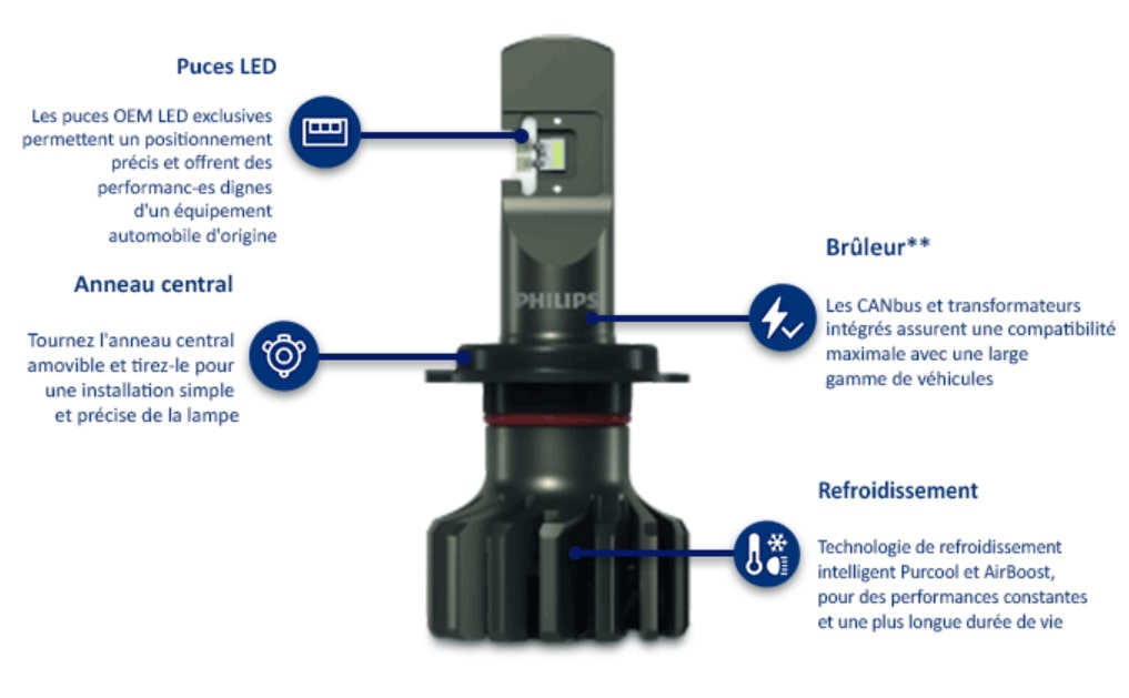 Homologuée en Corée du Sud depuis juillet 2020, en Allemagne depuis mai 2021 et en Autriche sept mois plus tard, la lampe Led Ultinon Pro peut désormais être utilisée en toute légalité sur le territoire français. Le certificat d’homologation TP LED 21072 des lampes Led rétrofit Philips H7-Led Ultinon Pro6001 délivré par les autorités françaises permet ainsi sur certains modèles de remplacer une lampe halogène d’origine par une lampe Led sans adaptation particulière.