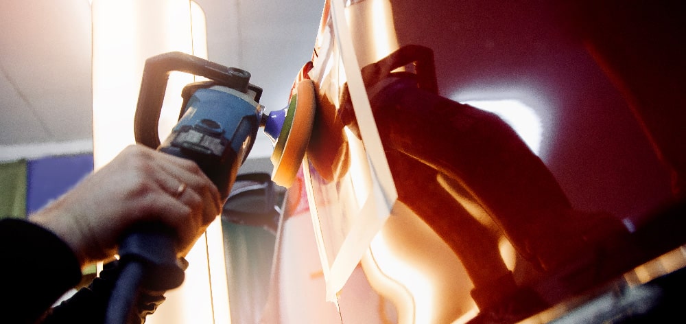Une fois la peinture parfaitement dépolie, il faut alors la repolir pour remonter la brillance. Ce polissage peut se faire en trois passes. La première est plus agressive et met en œuvre une polisseuse rotative, un pad en laine, et un abrasif (compound) agressif. Cette première étape doit supprimer toutes les marques du ponçage. Elle peut cependant générer un voile de micro rayures ou des hologrammes dus à la chauffe du vernis. La polisseuse doit fonctionner à faible vitesse. Pour supprimer ces défauts, une passe supplémentaire est nécessaire avec une combinaison pad/abrasif moins agressive, d’un niveau moyen. Enfin, une passe de finition peut être nécessaire si la brillance obtenue est jugée insuffisante. Il s’agira dans ce cas d’un polissage de finition classique. « Le savoir-faire du polissage repose sur le choix du diamètre du pad et sur la vitesse de polissage pour que le polish soit suffisamment chauffé pour être actif, sans pour autant brûler le vernis en allant trop vite. Il faut aussi savoir doser la quantité de produit et ne pas travailler sur de trop grande zone » explique Armand Lospied.