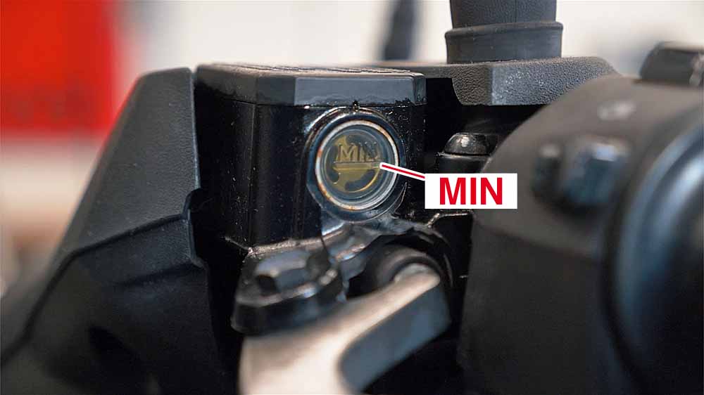 - Assurez-vous que le niveau du liquide de frein est au-dessus du repère de niveau minimum.