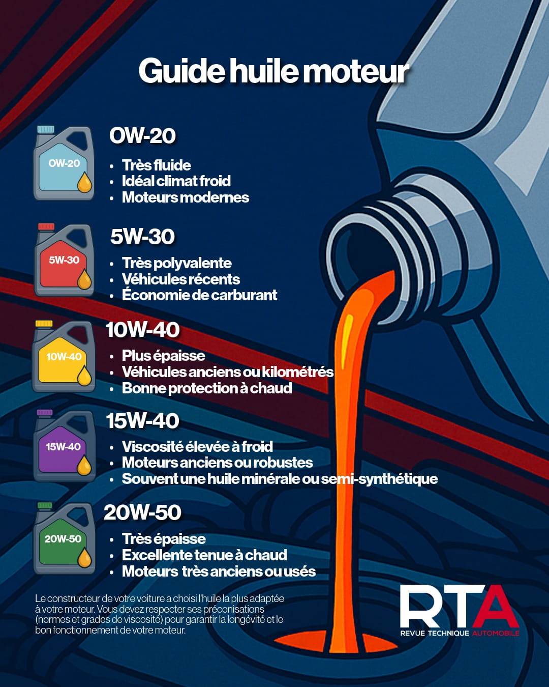 • 40 ou 50 : huiles plus épaisses, adaptées aux moteurs anciens ou sollicités