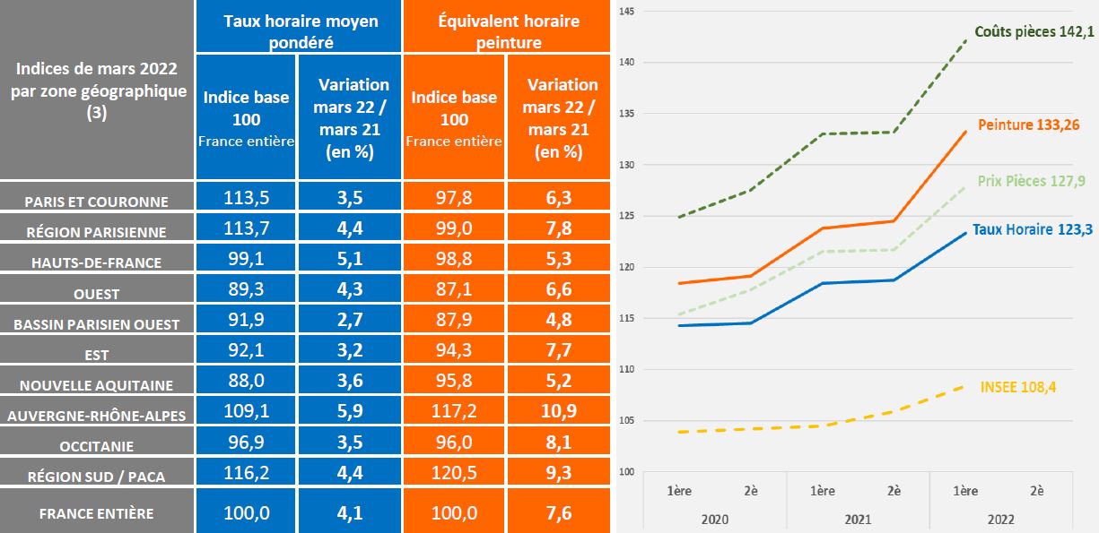 Les taux affichés dans les tableaux ne sont pas simples à interpréter. Si j'ai bien compris, ce ne sont pas les coûts horaires mais la disparité régionale d'un coût "indice 100 France entière". C'est un peu moins clair pour l'équivalent horaire du prix des ingrédients peinture. Par contre les courbes de droite semblent indiquer l'évolution dans le temps mais est-ce bien celle des mêmes indices que ceux des tableaux de droite ? Ce n'est pas clair. Et l'indice 100 là-dedans ? Après, je suis complètement d'accord avec Mecano51. Pour fixer les idées, dans le groupe Safran (90.000 personnes) où le coût de revient d'un ingénieur sur les sites français de recherche et développement (coût moyen tous âges et niveaux, incluant les salaires chargés, la part des locaux [m² de bureau, chauffage/clim, téléphone, moyens informatiques, etc.] plus électricité) est de l'ordre de 90€/h. Côté techniciens (production, maintenance, etc) le salaire est 3 fois moindre mais les moyens sont plus importants qu'en R&D. Dans les garages, les taux pratiqués sont souvent au-dessus de ça alors que les salaires sont bien loins de ceux des ingénieurs de chez Safran.
