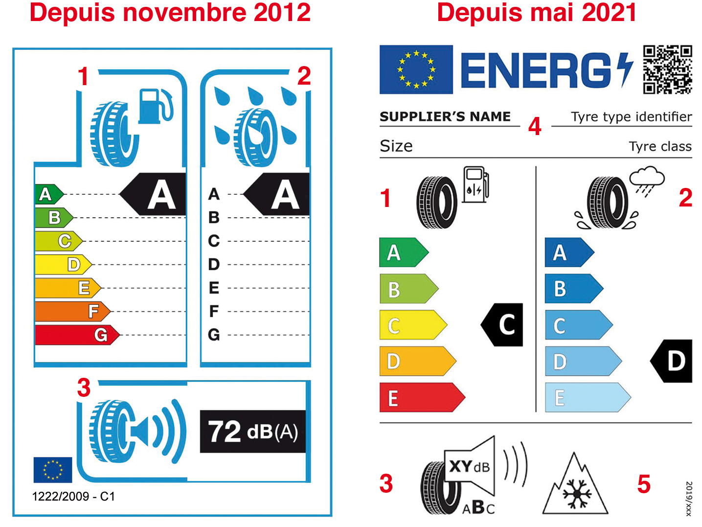 Pour rendre cette étiquette plus pertinente, une nouvelle version est mise en place à partir de mai 2021 (n° 2020/740). Elle comporte des informations supplémentaires (pictogrammes attestant d’un niveau minimal de performance sur neige et sur glace ; QR Code intégrant toutes les données numériques de l’étiquette et les informations sur l’homologation du pneu). Elle s’applique aussi aux pneus des véhicules utilitaires lourds.