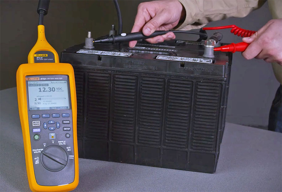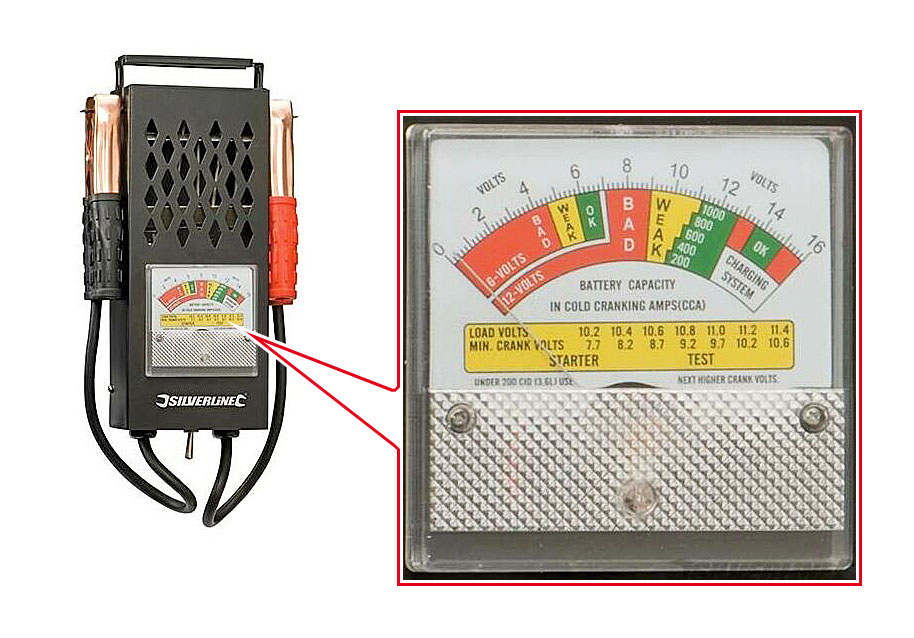 **. Un contrôleur de batterie permet de faire un test de capacité en appliquant une consommation de forte intensité pour vérifier l'évolution de la tension et donc l'état de la batterie (appareil basique et peu couteux : à partir de 25 €) ; une forte baisse de la tension indique une batterie défectueuse (corrosion et/ou sulfatation des électrodes).