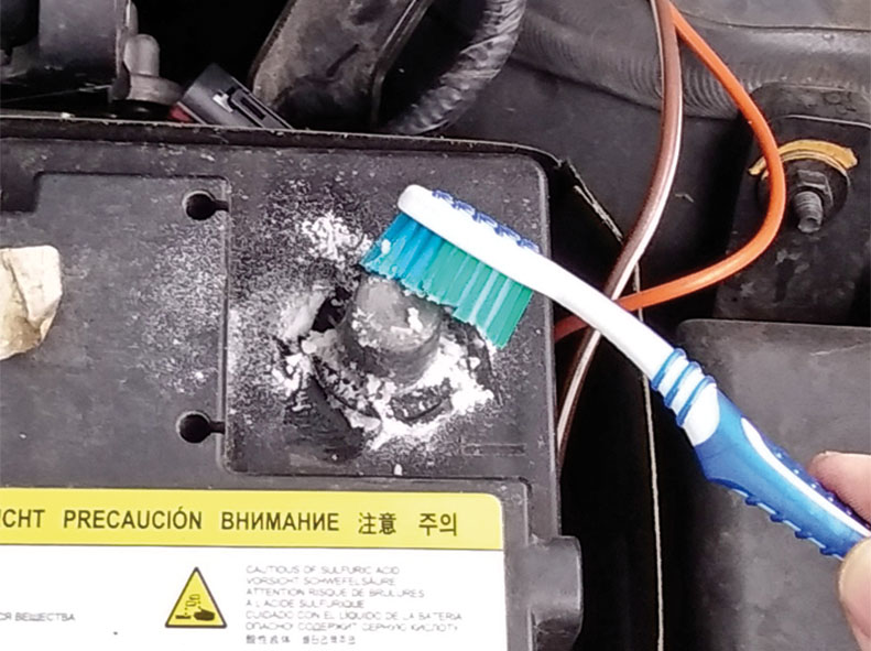 - À l'aide de la brosse à dents, frottez le mélange de bicarbonate sur les bornes de la batterie pour dissoudre les traces d'oxydation. Procédez de la même manière sur les cosses.