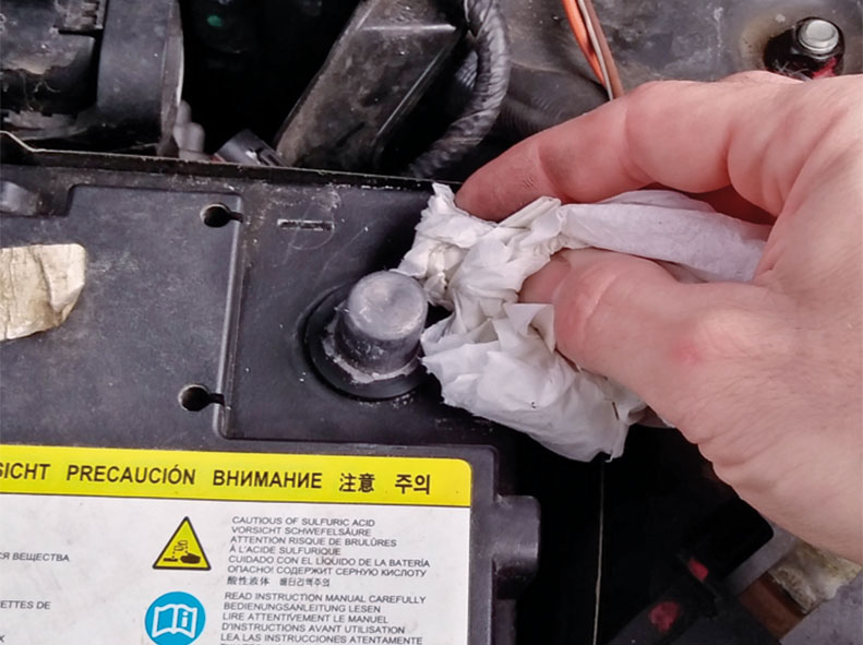 - Essuyez les résidus, rincez à l'eau puis séchez les bornes et les cosses à l'aide d'un chiffon sec.