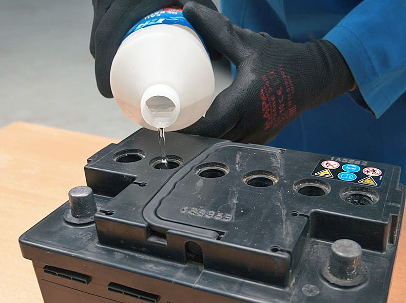 - Sur une batterie avec entretien ou à entretien réduit, déposez les bouchons ou le couvercle et vérifiez le niveau de l'électrolyte. Il doit se situer au niveau du repère, à environ 1 cm au-dessus des plaques. Si nécessaire, faites le niveau avec de l'eau déminéralisée ou distillée.