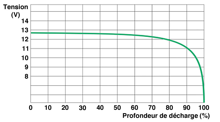 Nota : La tension de la batterie ne suffit pas pour un diagnostic car elle ne va baisser significativement qu'au-delà d'une profondeur de décharge de 70%. De plus, cette tension varie en fonction de la température.