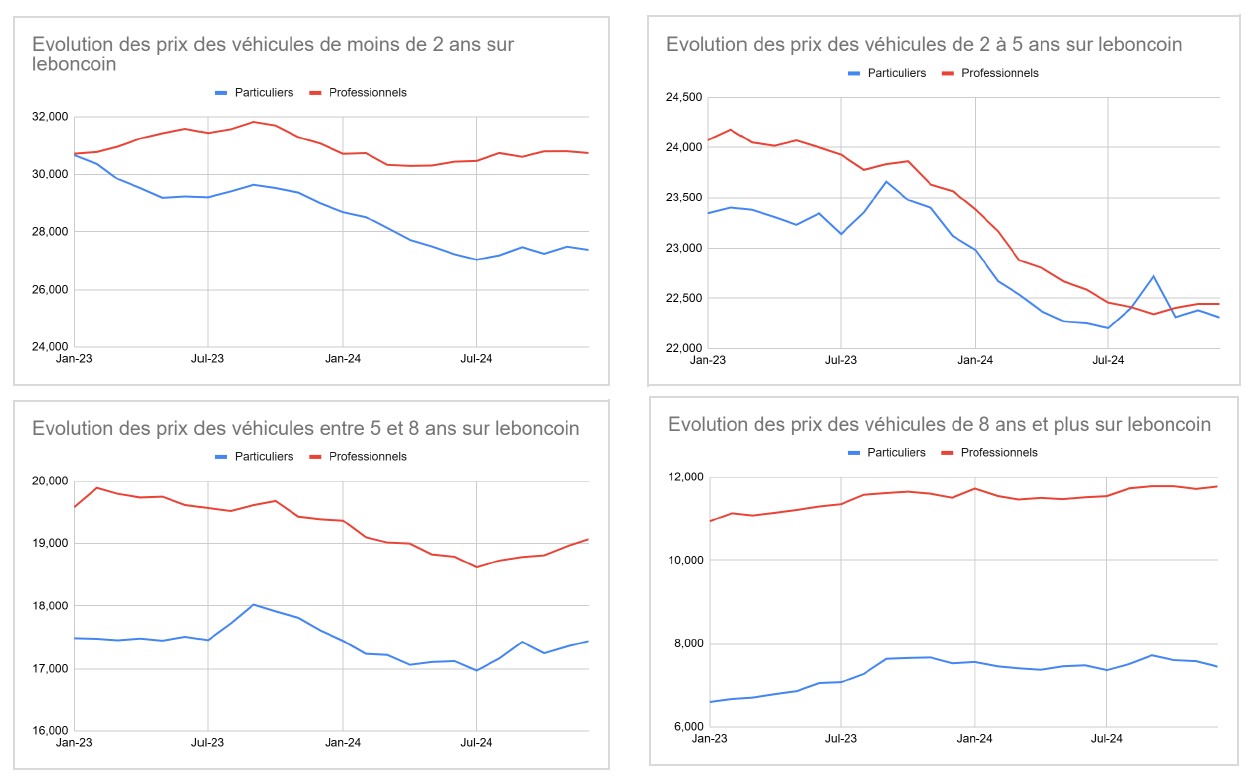 Ce sont les véhicules de moins de 2 ans qui connaissent la plus forte baisse des prix, catégorie sur laquelle les prix sont les plus élevés. Les prix des véhicules de plus de 8 ans, moins chers, restent assez stables. Dans un contexte économique difficile, la demande est croissante pour les véhicules les moins chers. Sur l’ensemble de l’année 2024, on constate en particulier une baisse importante des prix pour les véhicules âgés de 2 à 5 ans ; une baisse des prix plus importante chez les professionnels que les particuliers. Sur le dernier trimestre 2024, le prix global des véhicules d’occasion reste stable.
