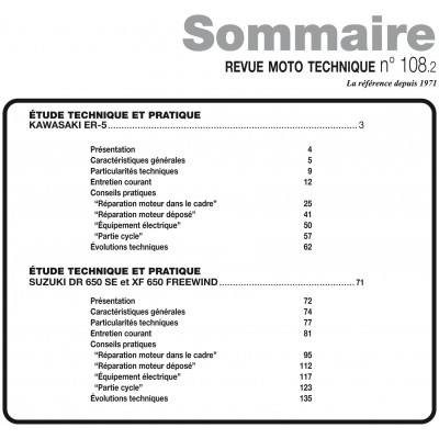 Cette présente RMT traite la KAWASAKI ER-5 (1997 et 1998), mais également la Suzuki XF 650 Feewind (modèles V et W de 1997 et 1998) et la Suzuki DR 650 SE (modèles T - V et W de 1996 à 1998).