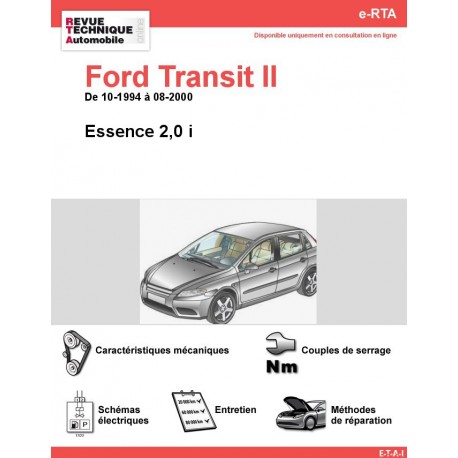Ce véhicule est traité sous sa version essence dans la Revue Technique de la Ford Transit II, produite durant la période 1994-2000. Cette RTA est un guide d'entretien et de réparation complet, réalisé par les experts en mécanique d'ETAI. Grâce à ce document, vous pouvez, intervenir, vous-même, sur les différents organes de votre fourgon, en toute sécurité. Par ailleurs, il existe aussi la RTA de la version de la Transit II.