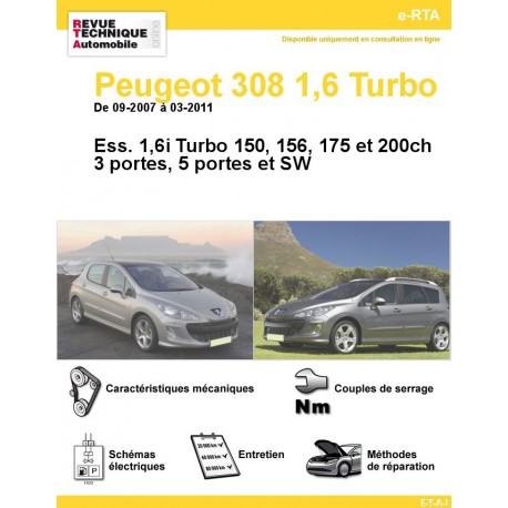 Cette Revue Technique présente les différentes caractéristiques mécaniques de la Peugeot 308 (1,6 Turbo et GTI) et vous propose des guides d'entretien et des schémas de démonstration qui vous assistent pour réparer vous-même votre véhicule.