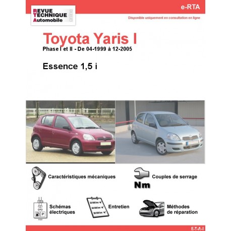 Cette voiture est traitée, sous sa version essence, dans la RTA de la Toyota Yaris I 1,5i, produite durant la période 1999-2005. En effet, la Revue technique est le guide indispensable à tous ceux qui souhaitent réussir, eux-mêmes, les diverses opérations d’entretien de leur véhicule comme la vidange, le changement des filtres, le remplacement des ampoules, et bien d’autres.
